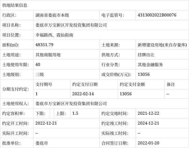 掛牌出讓供地結果信息(婁底市萬寶新區開發投資集團有限公司-幸福路西、霞仙街南)